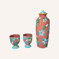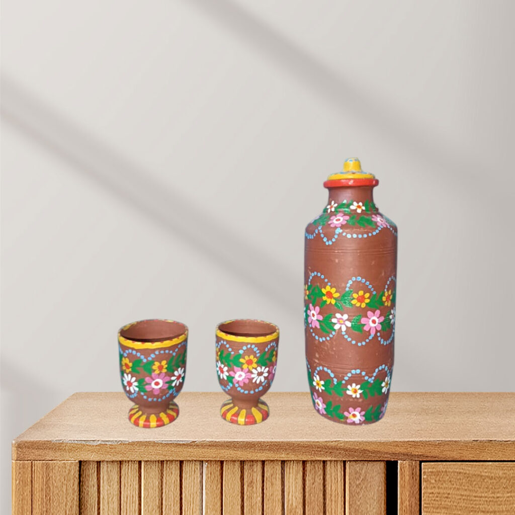 Artisan Clay Water Bottle Set | Terracotta Bottle with Floral Chiteri Painting & 2 Glasses